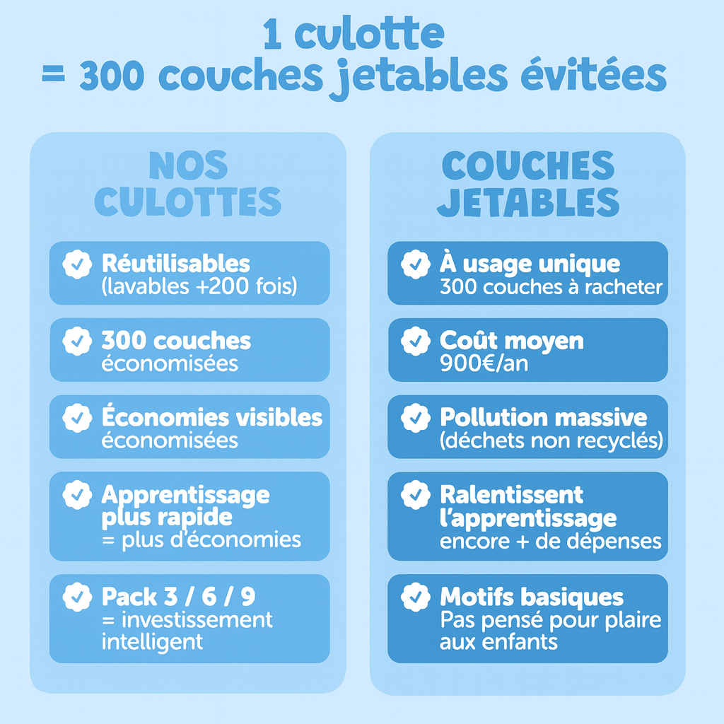 Les Culottes Magiques® ressemblent à un vrai sous-vêtement 🌟, sont lavables et réutilisables, et aident l’enfant à ressentir ses besoins, contrairement aux couches jetables.